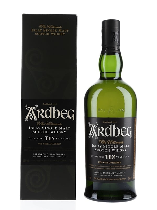 A bottle of Ardbeg 10 Year Old The Ultimate Islay Single Islay Malt Scotch Whisky. The bottling code indicates this was bottled on 4 August 2014 .