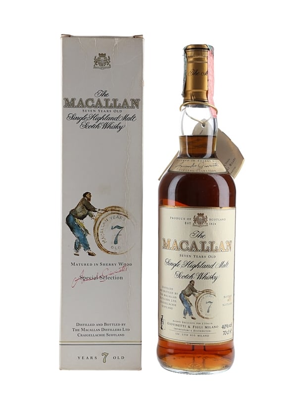 A bottle of The Macallan 7 Year Old Single Highland Malt Scotch Whisky, exclusively matured in selected Spanish sherry casks and imported to Italy by Giovinetti, we estimate in the 1990s to early 2000s.