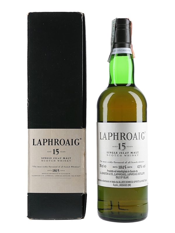 An old presentation bottle of Laphroaig 15 Year Old Single Islay Malt Scotch Whisky. This was imported to Italian market by Allied Domecq Spirits & Wine, we estimate in the 1990s.