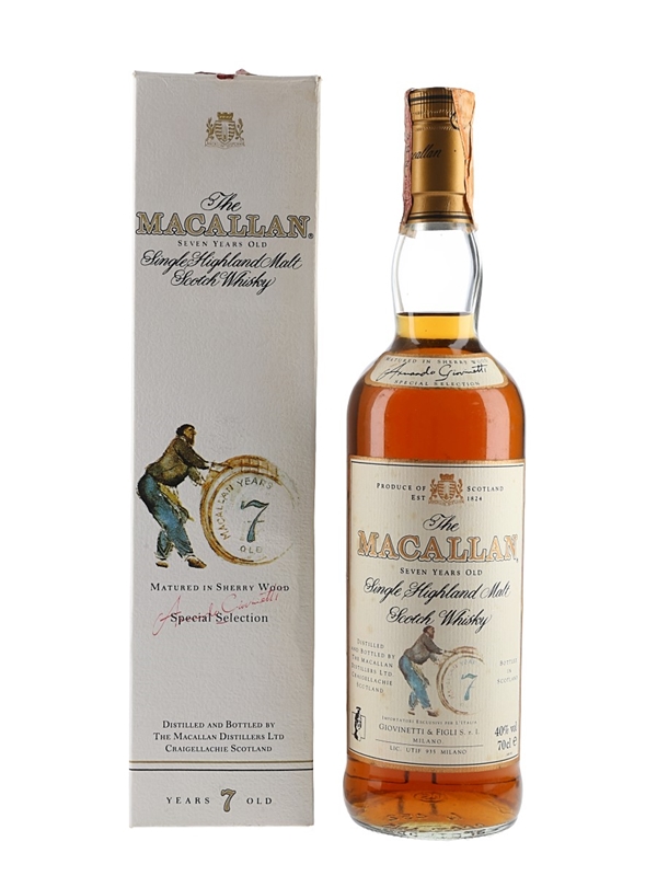 A bottle of The Macallan 7 Year Old Single Highland Malt Scotch Whisky, exclusively matured in selected Spanish sherry casks and imported to Italy by Giovinetti, we estimate in the 1990s.