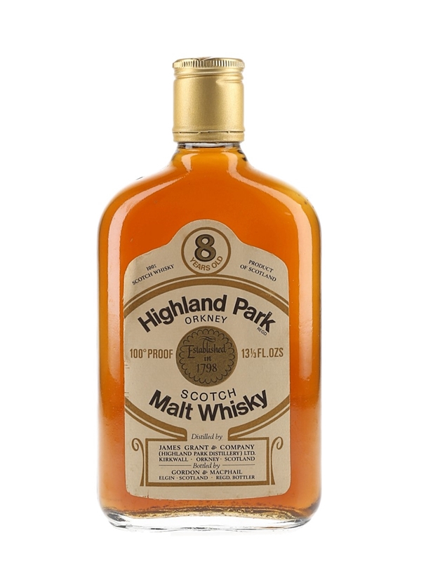 A half bottle of Highland Park 8 Year Old 100 Proof Orkney Scotch Malt Whisky, distilled by James Grant & Company and bottled by Gordon & MacPhail. We estimate this was bottled in the 1970s.