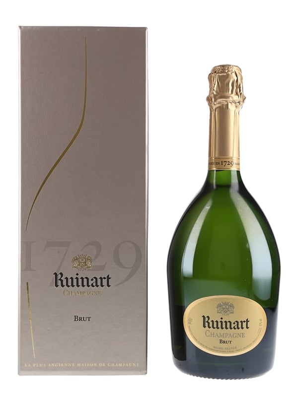 A bottle of Ruinart Blanc de Blancs Champagne presented in an 18th century replica bottle with gift box. This is produced solely from Chardonnay grapes and comes from the oldest Champagne house in the world.