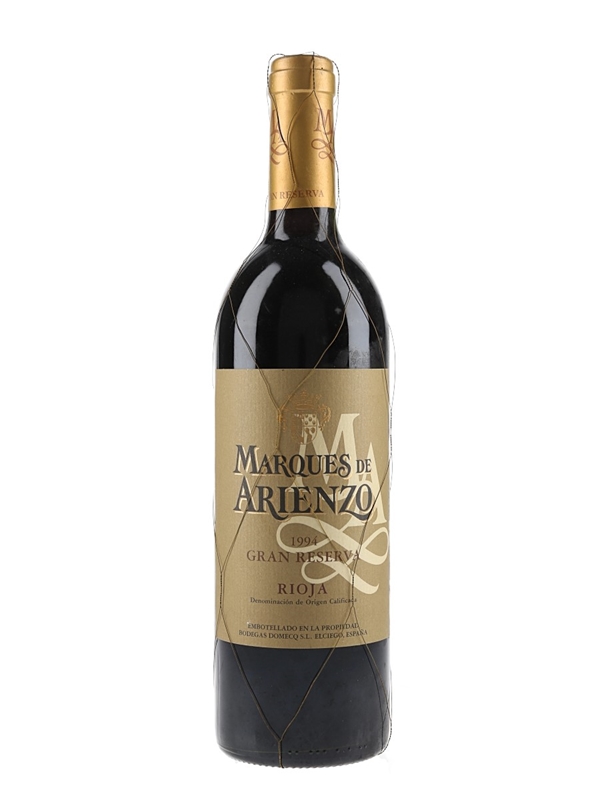 A bottle of 1994 Marques de Arienzo Gran Reserva Rioja, made exclusively from the Tempranillo grape variety harvested from vineyards located in Elciego and LaGuardia by Bodegas Domecq.