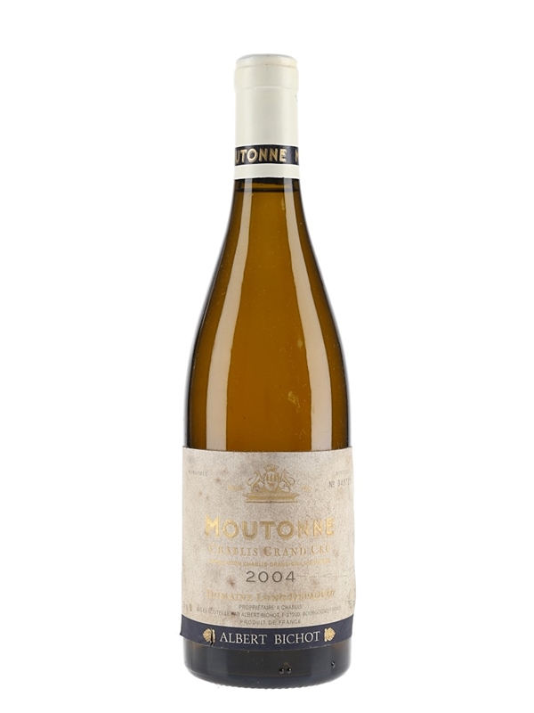 A bottle of Chablis Grand Cru Moutonne 2004 from Domaine Long Depaquit, bottled by Albert Bichot, the sole owners of the 2.5 hectare Moutonne vineyard, which is situated on the upper slopes of a natural amphitheatre between Vaudésir and Les Preuses.