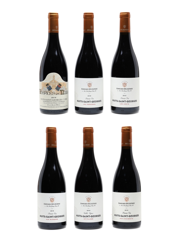 A branded wooden case of 6 bottles of Edouard Delaunay’s speciality appellation in Burgundy, Nuits Saint Georges, including 5 Premiers Crus: