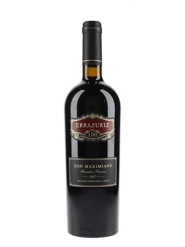 A bottle of Errazuriz 2017 Don Maximiano Founder's Reserve from Valle de Aconcagua, Chile, a blend of Cabernet Sauvignon, Carménère, Malbec, Petit Verdot and Cabernet Franc.