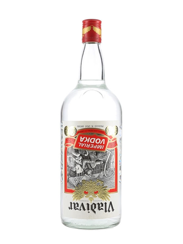 A bottle of Vladivar Imperial Vodka, produced by Gilbert & John Greenall Ltd. in Warrington, Great Britain. We estimate this was bottled in the 1970s.