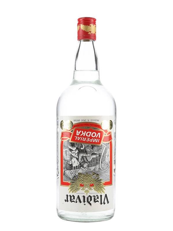 A bottle of Vladivar Imperial Vodka, produced by Gilbert & John Greenall Ltd. in Warrington, Great Britain. We estimate this was bottled in the 1970s.