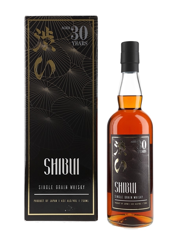 A bottle of Shibui 30 Year Old Single Grain whisky from Japan. This was distilled twice in traditional Japanese stainless steel pot stills before being reserved in a combination of ex bourbon, Spanish Sherry and White Oak. This was imported to Beverly Hills, California, by Ind Beverages.
