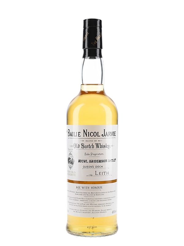 A bottle of The Bailie Nicol Jarvie Very Old Reserve Blend Of Old Scotch Whisky. This bottling was discontinued by Glenmorangie in 2014.