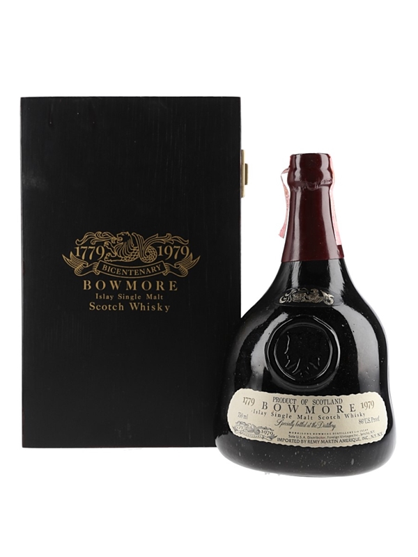 A bottle of Bowmore Islay Single Malt Scotch Whisky, matured in sherry casks and bottled in 1979 to celebrate the distillery's bicentenary. This is packaged in a hand blown decanter with presentation box and stopper and comes with a certificate of authenticity. This was imported to the US by Remy Amerique Inc., New York.