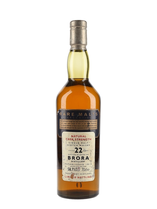 A limited edition bottle of Brora 22 Year Old Natural Cask Strength Single Malt Scotch Whisky. This was distilled in 1972 and bottled at a cask strength of 58.7% ABV for Diageo's now-discontinued Rare Malts Selection range.
