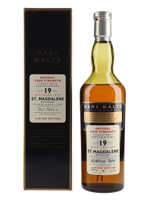 A bottle of St Magdalene 19 Year Old single malt Scotch whisky. This was distilled in 1979 and released in October 1998 as part of Diageo's now discontinued Rare Malts range.