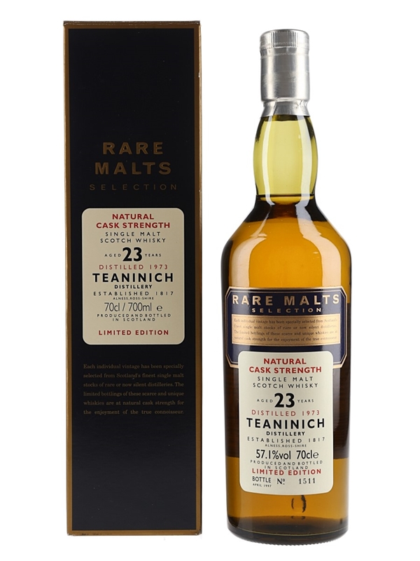 A bottle of Teaninich 23 Year Old Single Malt Scotch Whisky. This was distilled in 1973 and bottled in April 1997 for Diageo's now-discontinued Rare Malts Selection.