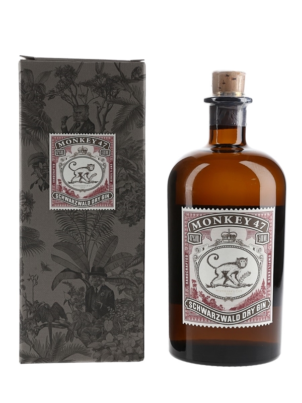 A 50cl bottle of Monkey 47 Schwarzwald Distiller's Cut Dry Gin from Germany's Black Forest. A total of 47 regional botanicals, including Galium odoratum, are used in the production of this unfiltered gin, bottled at 47% ABV.