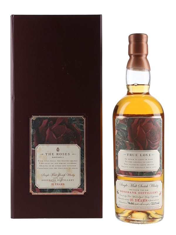 A bottle of Rosebank 21 Year Old Single Malt Scotch Whisky, bottled by Speciality Drinks Ltd. This release, True Love, is the first edition in the Rosebank Roses series.