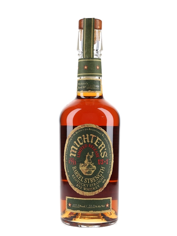 A bottle of Michter's US*1 Limited Release Barrel Strength Kentucky Straight Rye Whiskey, matured in a single charred white oak barrel and bottled at a cask strength of 53.9% ABV. This was imported to the UK by Speciality Brands Ltd.