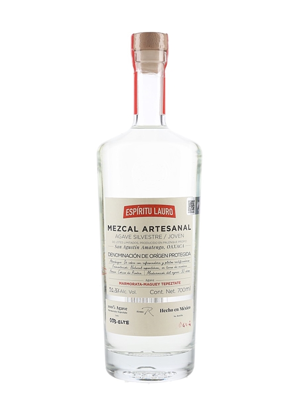 A bottle of Espiritu Lauro Mezcal Joven produced in San Agustin Amatengo, Oxaca and bottled by Espiritu Corsa from using 30 year old Marmorata-Maguey Tepeztate agave plants. This was imported to the UK by Mexican Booze Ltd., London.