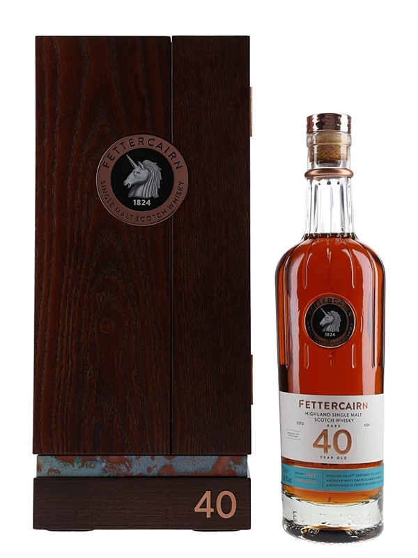 A limited edition bottle of Fettercairn 40 Year Old Rare Vintage Single Highland Malt Scotch Whisky, presented in a wooden box. This was distilled on 23 December 1977, matured in American White Oak Ex-Bourbon Barrels and finished in Apostoles Sherry Cask No.6.