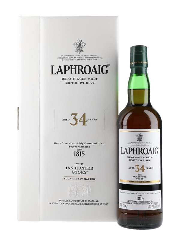 A bottle of Laphroaig 34 Year Old Islay Single Malt Scotch Whisky, this is the book number four of the serie which celebrate the malt master, and was fully matured in American oak ex-Bourbon and first-fill Oloroso Sherry casks and bottled at 46.2% ABV.