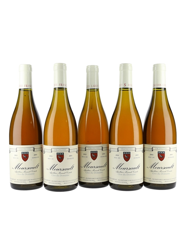 This lot contains six bottles of 2003 Meursault Clos du Domaine Francois Labet, bottled by Henri Darnat in Meursault, France.