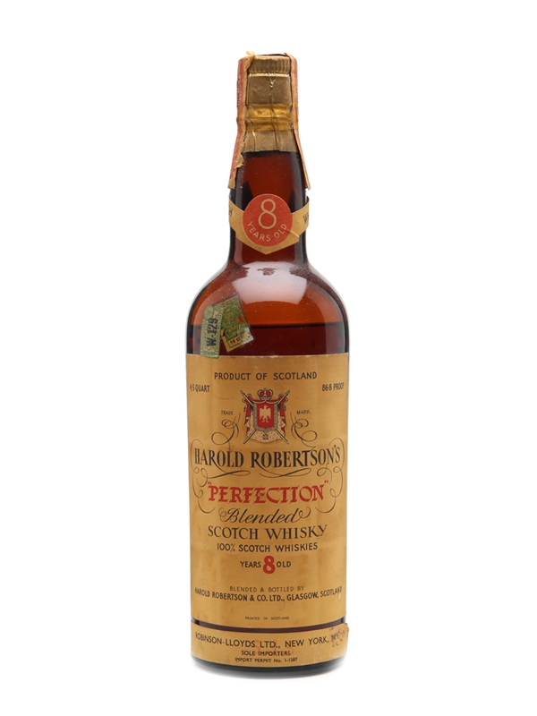A bottle of Harold Robertson's Perfection 8 Year Old Blended Scotch whisky. Blended & bottled by Harold Robertson & Co Ltd.