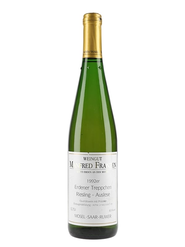 A bottle of 1992 Erdener Treppchen Riesling Auslese produced by Weingut Manfred Franzen in Germany's Mosel valley. Auslese means 'select harvest' and refers to hand harvested whole bunches of fruit featuring nobly rotten clusters, resulting in juice with between 191 and 260 grams per litre of sugar.