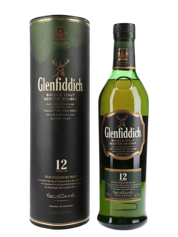 A bottle of Glenfiddich 12 Year Old Our Signature Malt Single Malt Scotch Whisky, matured in oloroso sherry and bourbon casks.