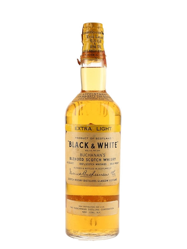 A bottle of Black & White Extra Light Blended Scotch Whisky, sealed with a spring cap closure. This was imported to the US by The Fleischmann Distilling Corporation, New York, we estimate in the mid 1960s.