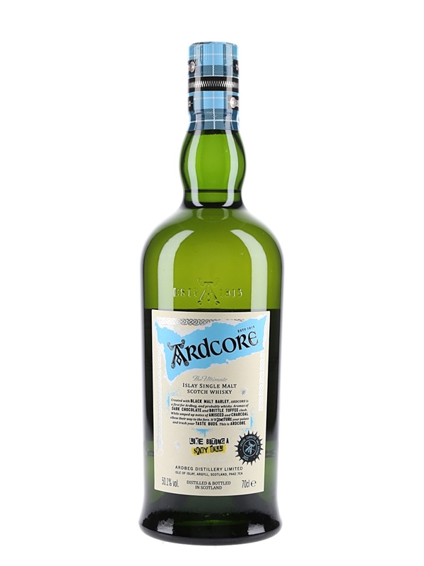 A bottle of Ardbeg Ardcore Islay Single Malt Scotch Whisky, made with black malt barley and bottled at a cask strength of 50.1% ABV.