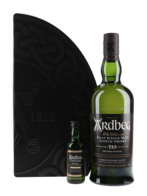 A gift pack containing a bottle of Ardbeg 10 Year Old with a Uigeadail Miniature.