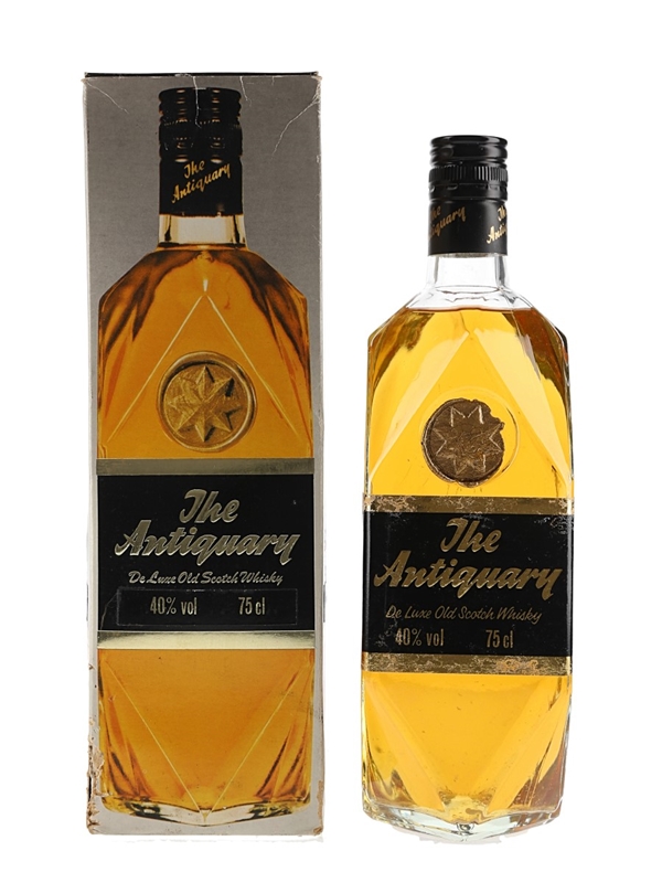 A bottle of The Antiquary De Luxe Old Scotch Whisky, distilled, blended and bottled by J W Hardie Ltd. We estimate this was bottled in the 1980s.