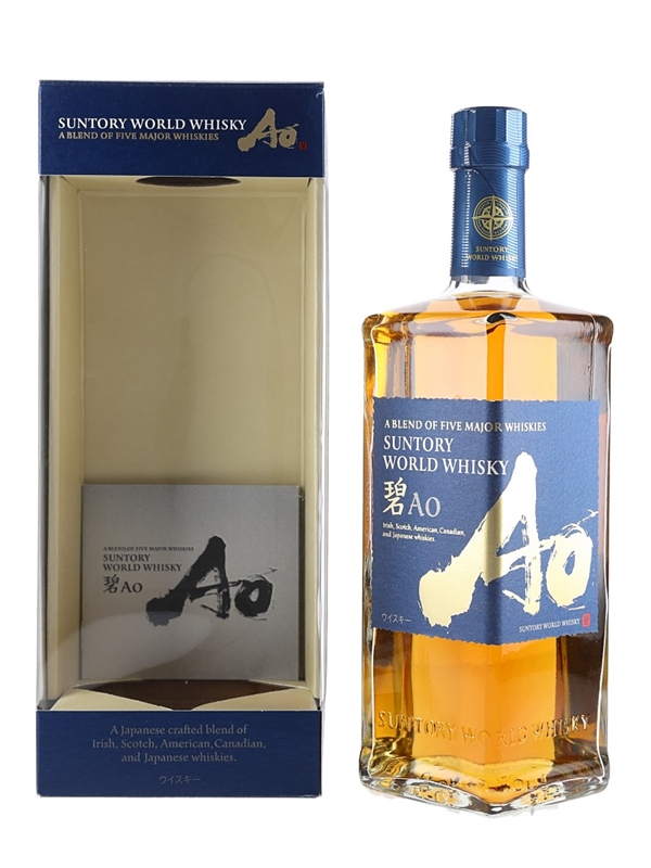 A bottle of Suntory World Whisky AO, a blend of five major whiskies: Irish, Scotch, American, Canadian, and Japanese.