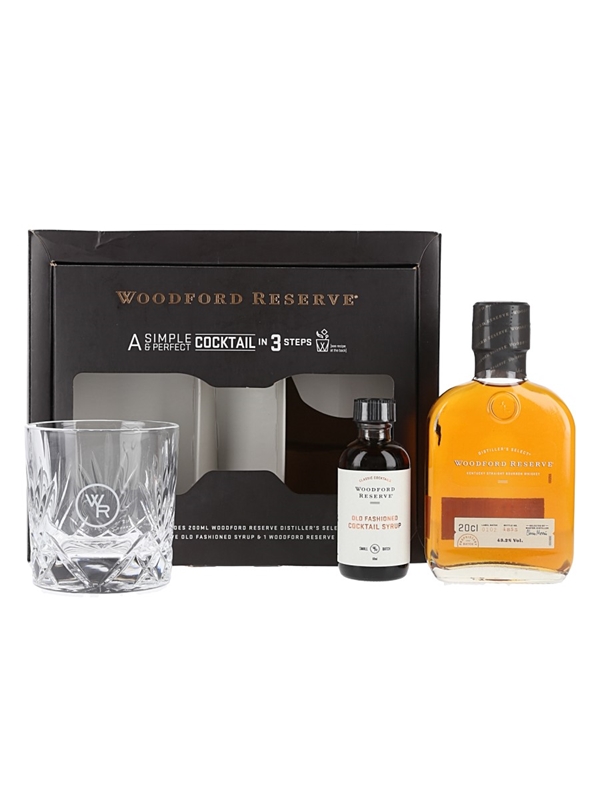 A set from Woodford Reserve to help you make A Simple & Perfect Cocktail in 3 Steps. This includes a 20cl bottle of Woodford Reserve Distiller's Select Kentucky Straight Bourbon Whiskey, a 6cl miniature bottle of Woodford Reserve Old Fashioned Cocktail Syrup and a branded glass.