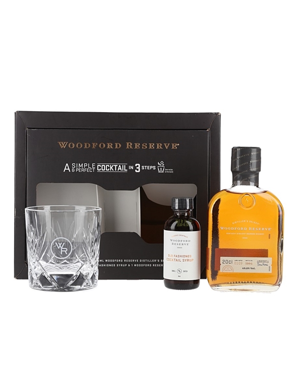 A set from Woodford Reserve to help you make A Simple & Perfect Cocktail in 3 Steps. This includes a 20cl bottle of Woodford Reserve Distiller's Select Kentucky Straight Bourbon Whiskey, a 6cl miniature bottle of Woodford Reserve Old Fashioned Cocktail Syrup and a branded glass.