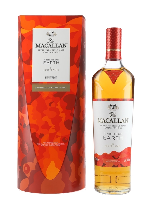 A limited edition bottle of The Macallan A Night On Earth in Scotland Highland Single Malt Scotch Whisky, celebrating the joy of New Year's Eve, known in Scotland as Hogmanay. This was aged in European and American sherry seasoned oak casks and ex-bourbon American oak casks. The packaging was designed by Japanese-French illustrator Erica Dorn.
