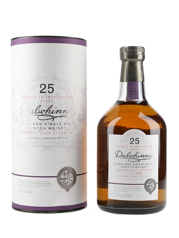 A bottle of Dalwhinnie 25 Year Old Highland Single Malt Scotch Whisky. This was distilled in 1987, matured in rejuvenated American oak casks and bottled at 52.1% ABV for Diageo's Special Releases in 2012.
