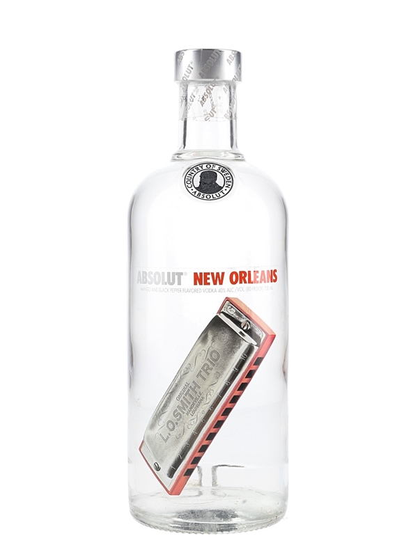 A 2007 limited edition bottle of Absolut New Orleans, a Swedish vodka flavoured with mango and black pepper. This was imported to the US by Absolut Spirits Co., New York.