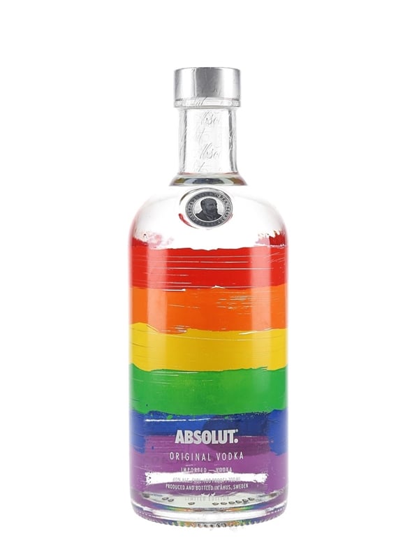A 2017 limited edition bottle of Absolut Rainbow vodka, produced in Sweden. This edition celebrates the 40th anniversary of Gilbert Baker's rainbow flag.