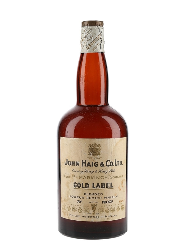 A bottle of John Haig & Co. Ltd. Gold Label Blended Liqueur Scotch Whisky, sealed with a spring cap closure. We estimate this was bottled in the 1940s.