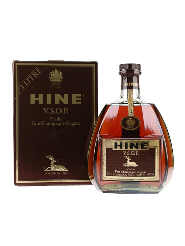 A litre bottle of Hine VSOP Vieille Fine Champagne Cognac. We estimate this was bottled in the 1980s.