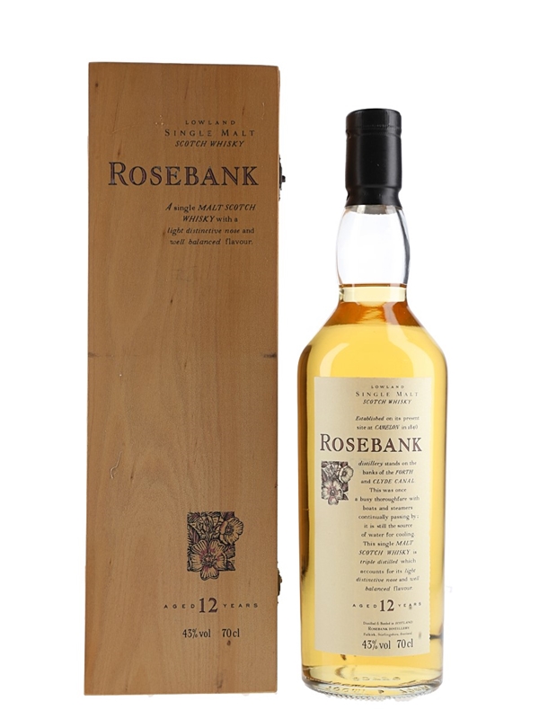 A bottle of Rosebank 12 Year Old Lowland Single Malt Scotch Whisky, released as part of Diageo's Flora & Fauna series.