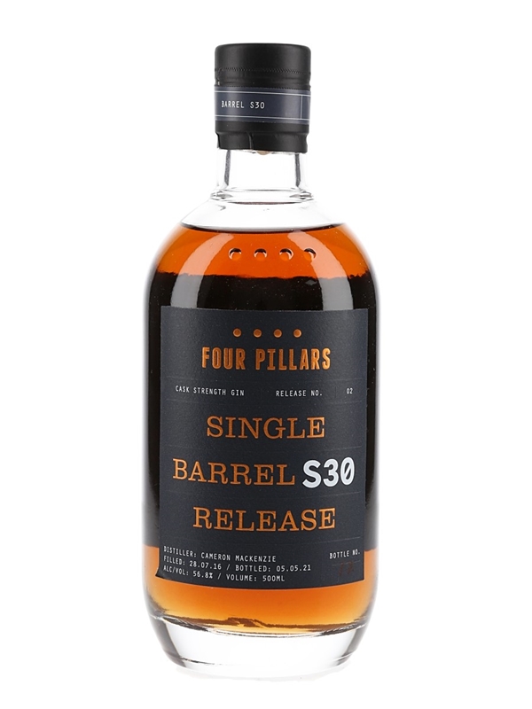 A 50cl bottle of Four Pillars Single Barrel Release Cask Strength Gin produced in Australia. This was filled on 28 July 2016, aged for four and a half years, before being bottled at a cask strength of 56.8% ABV on 5 May 2021.
