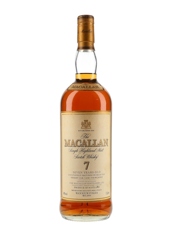 A litre bottle of The Macallan 7 Year Old Single Highland Malt Scotch Whisky, exclusively matured in selected Spanish sherry casks and imported to Italy by Maxxium Italia. We estimate this was bottled in the 2000s.
