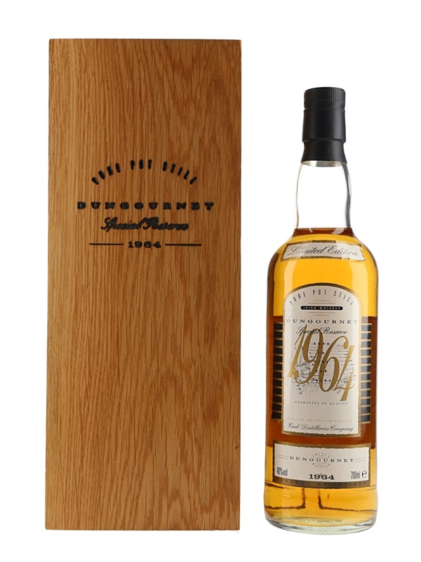 A limited edition bottle of Dungourney 1964 30 Year Old Special Reserve Pure Pot Still Irish whiskey, distilled, matured and bottled by Cork Distilleries Company. This comes in a wooden presentation box.