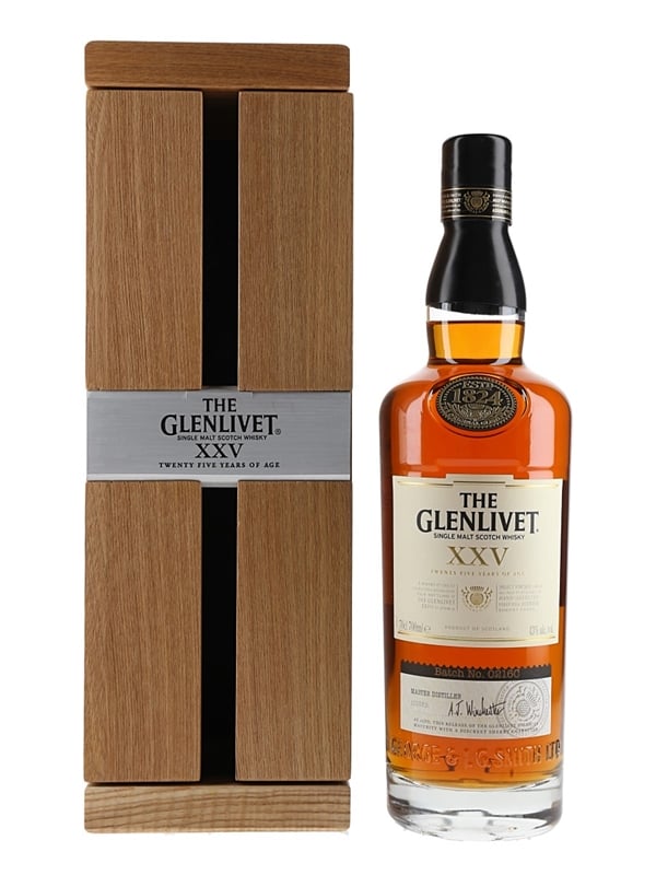 A bottle of Glenlivet XXV 25 Year Old Single Malt Scotch Whisky which spent its final maturation in a first fill oloroso sherry cask. This bottle is presented in a wooden case and secured with a metal plaque. This is from batch number 0216C.
