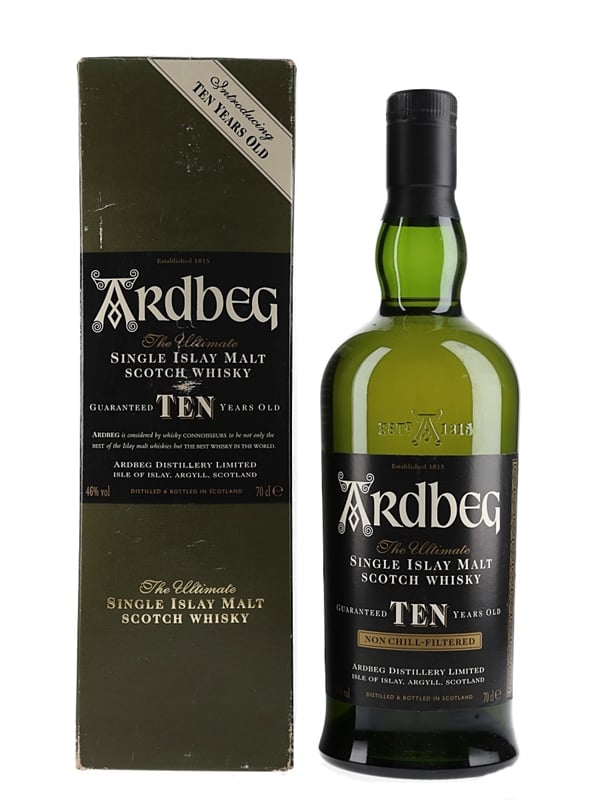 A bottle of Ardbeg 10 Year Old 'Introducing'. This is the first release, bottled in 2000.