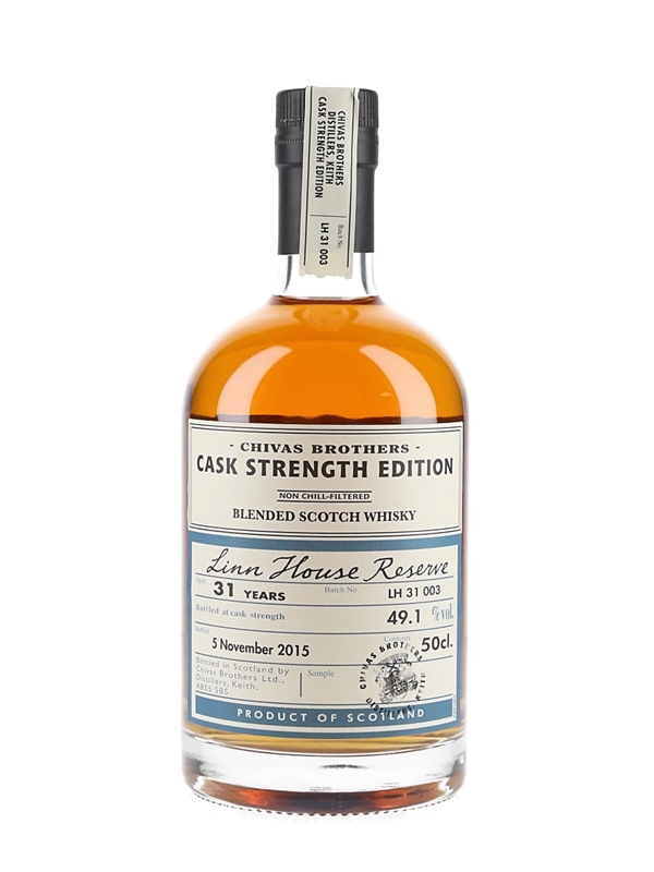 A 50cl bottle of Chivas Brothers 31 Year Old Linn House Reserve Blended Scotch Whisky, part of the Cask Strength Edition series bottled at 49.1% by Chivas Brothers Ltd.