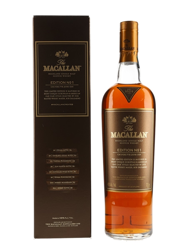A limited edition bottle of The Macallan Edition No.1 Highland Single Malt Scotch Whisky. This was made from a combination of eight types of American and European oak matured whiskies, bottled at 48% ABV.