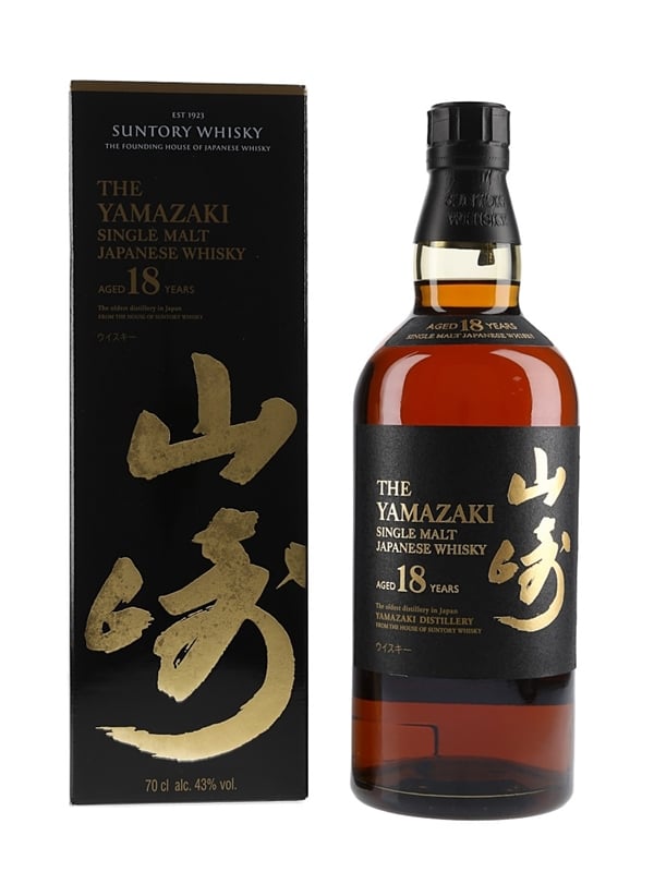 A bottle of The Yamazaki 18 Year Old Single Malt Japanese Whisky produced in Japan and imported to Spain by Beam Suntory Distribution.